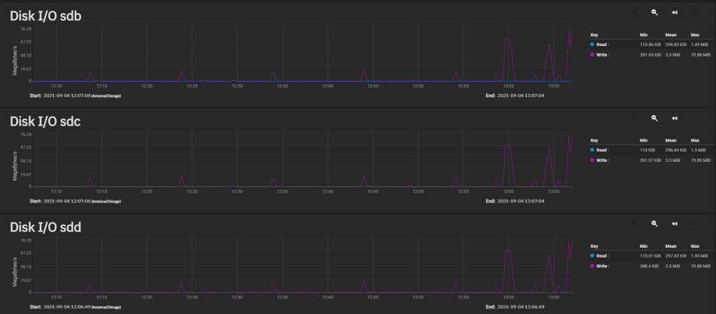 Disk I/O showed something interesting. It showed I could likely use quite a bit more bandwidth before my array became a bottleneck. I imagine each of my exos drives could do a fair amount more I/O. 76MB/s is nothing.