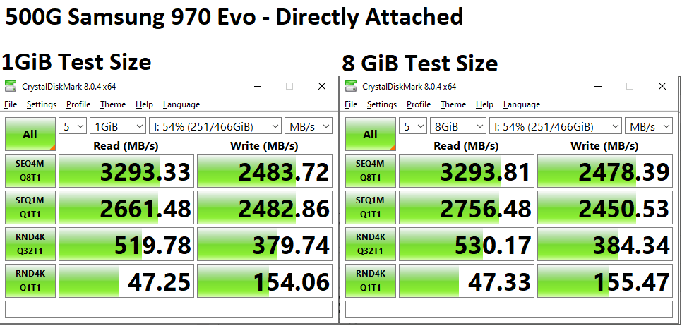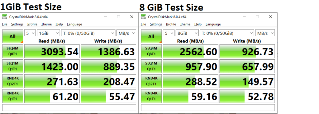Many people will argue that all of your results are “cached” in ram at a 1G test size. While, this may be completely accurate- Remember, in the real world, you don’t move massive files very often!