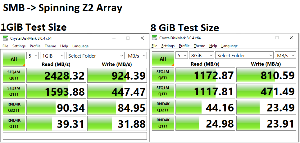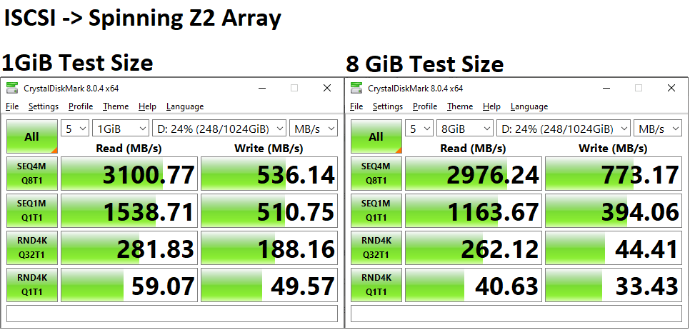 What is very interesting about this test- The read speeds…. are basically identical to that of my NVMe array. For a Z2 pool consisting of a bunch of dirt-cheap 8TB disks I picked up, This is quite impressive to me. Write speeds, as you would expect, aren’t nearly as good… Parity calculation, and spinning disk performance shows its face here. I am willing to bet 8GB writes will be much worse.