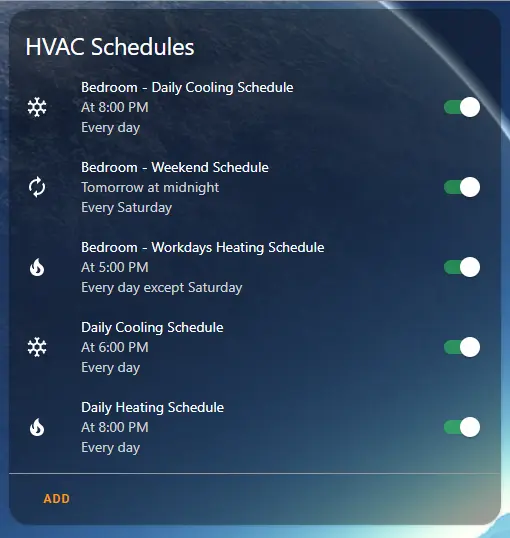 Completed view, with separate schedules for heating and cooling, for both my primary HVAC, as well as my mini-split. Upon clicking any of the above schedules, you can easily change/add/remove setpoints/modes.
