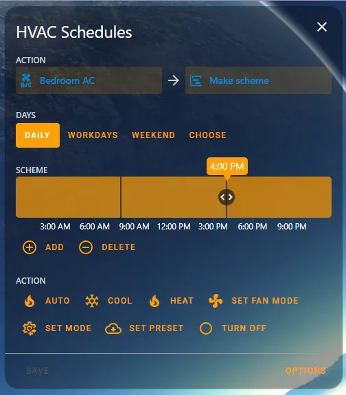 Next, I only want this schedule to become active if a few conditions are met. So, click “OPTIONS” in the bottom right.