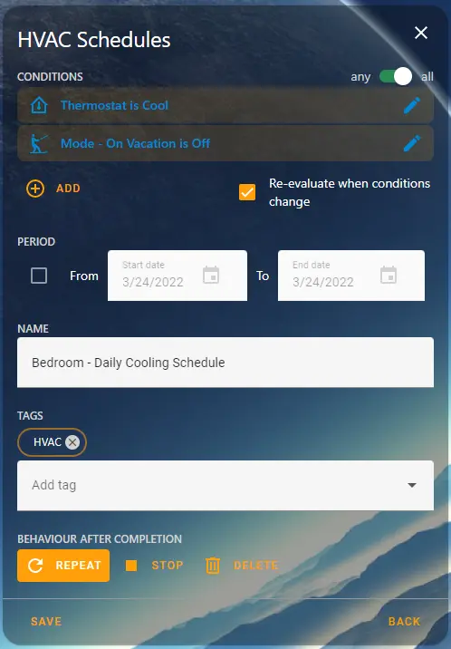 - I only want this schedule active if vacation mode is OFF. I will have a separate schedule for vacation mode (which only serves the purpose of keeping the house from freezing, and below 90F).