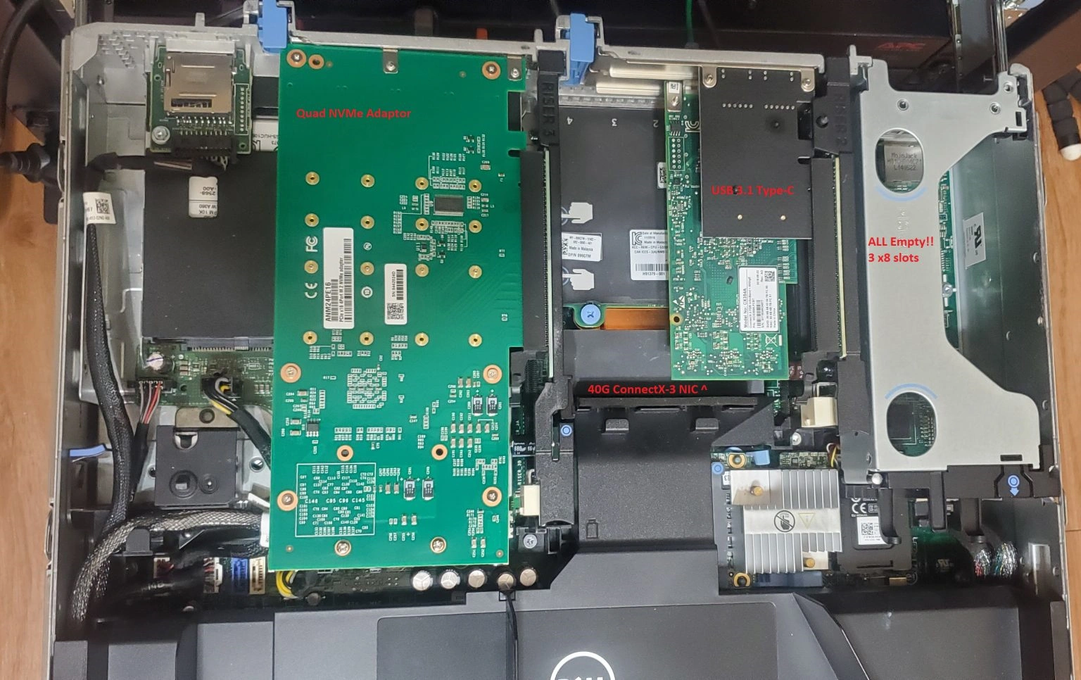 If the mspaint labels are not readable, the card on the left is the new quad NVMe switch, in the middle, I have a dual port 40Gbit ConnectX-3 NIC, with a USB 3.1 Type-C on top. The riser on the right has all three slots completely empty.