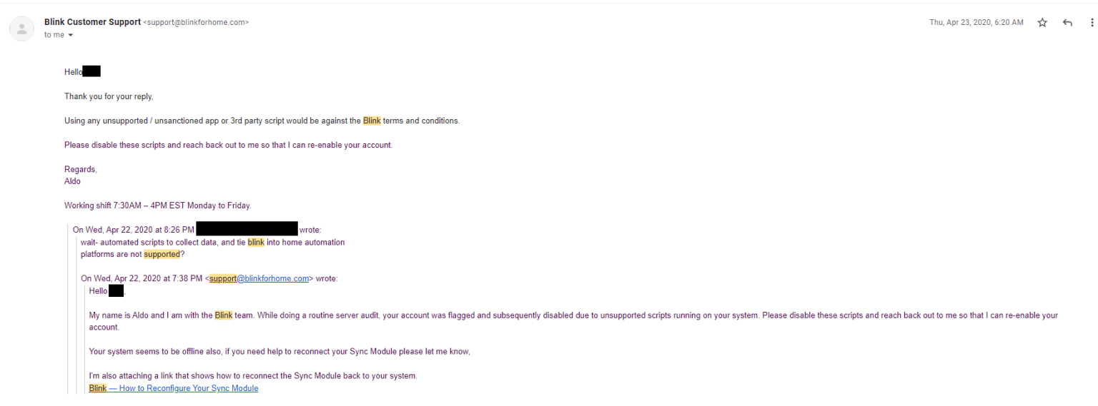Blink stating any 3rd party automation is against their TOS. For the record, Home-Assistant, Hubitat, HomeSeer.... are all 3rd party integrations.