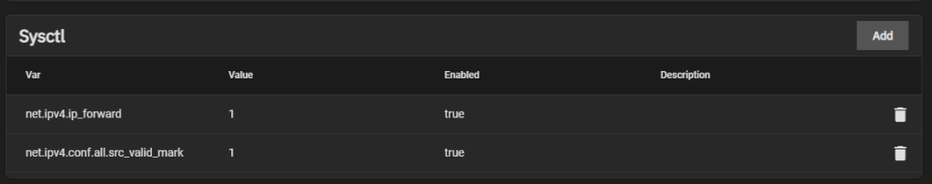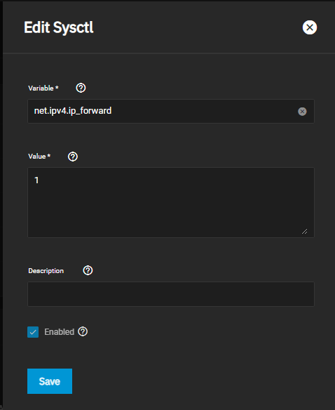 We will need to add a new value, which will enable ipv4 forwarding. This is required for packets to be forwarded from your VM's, to the TrueNAS host.