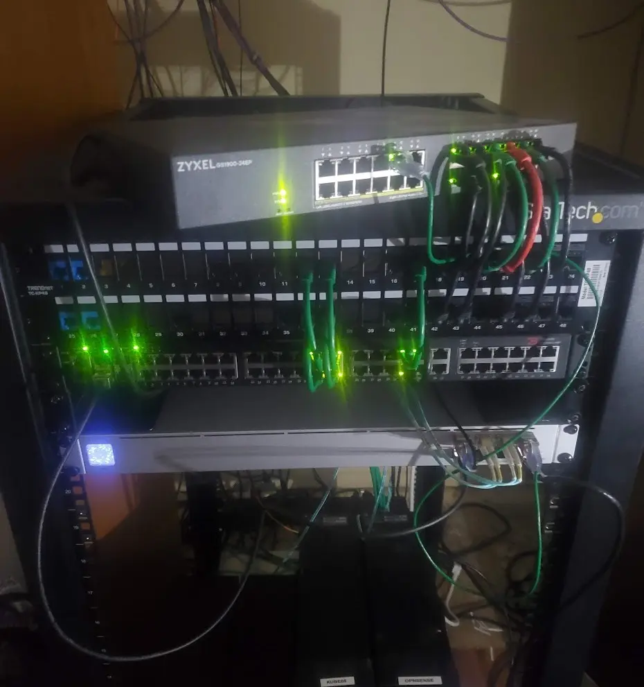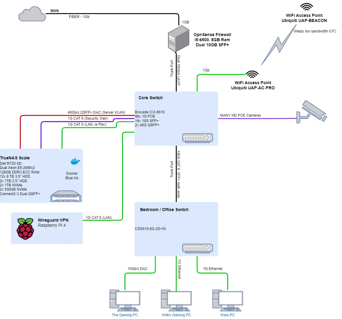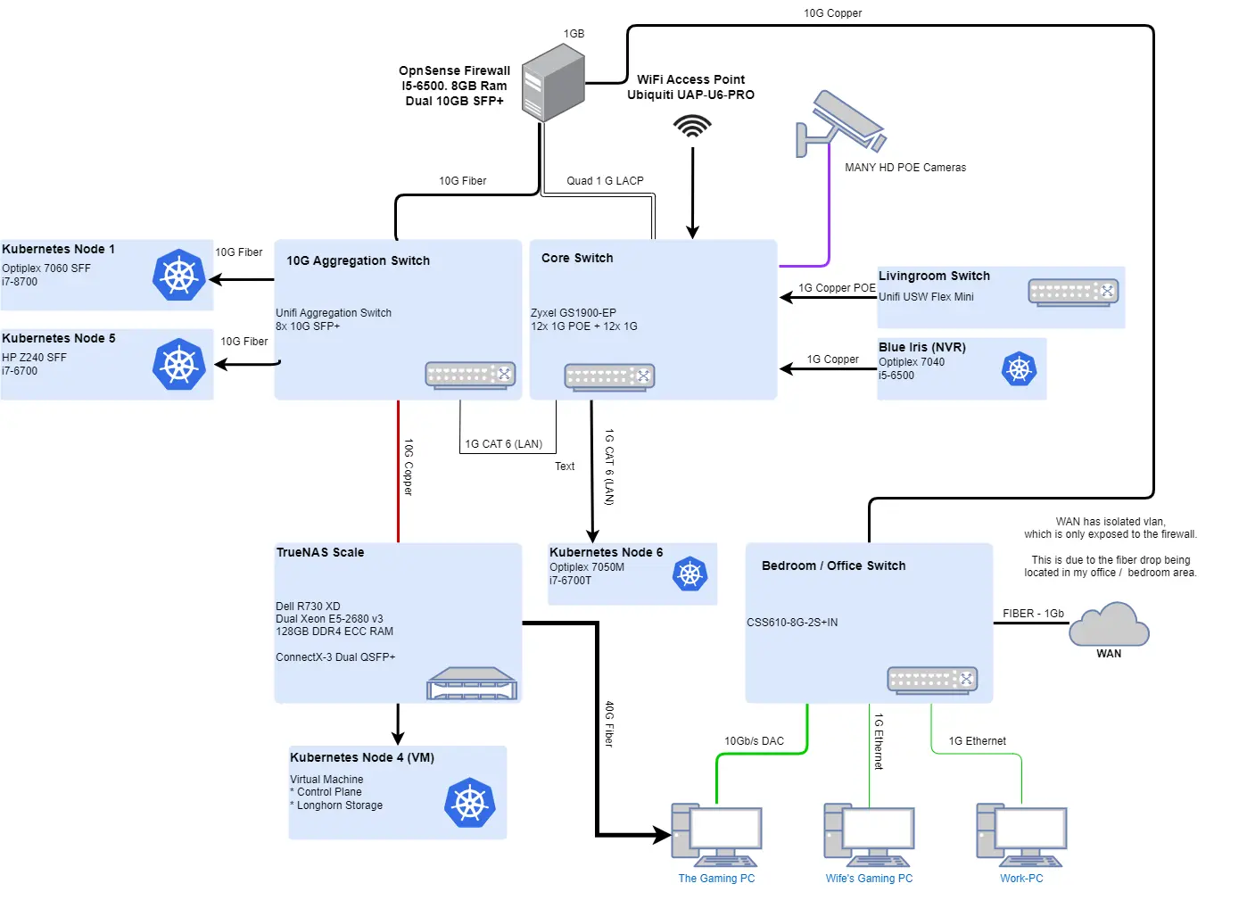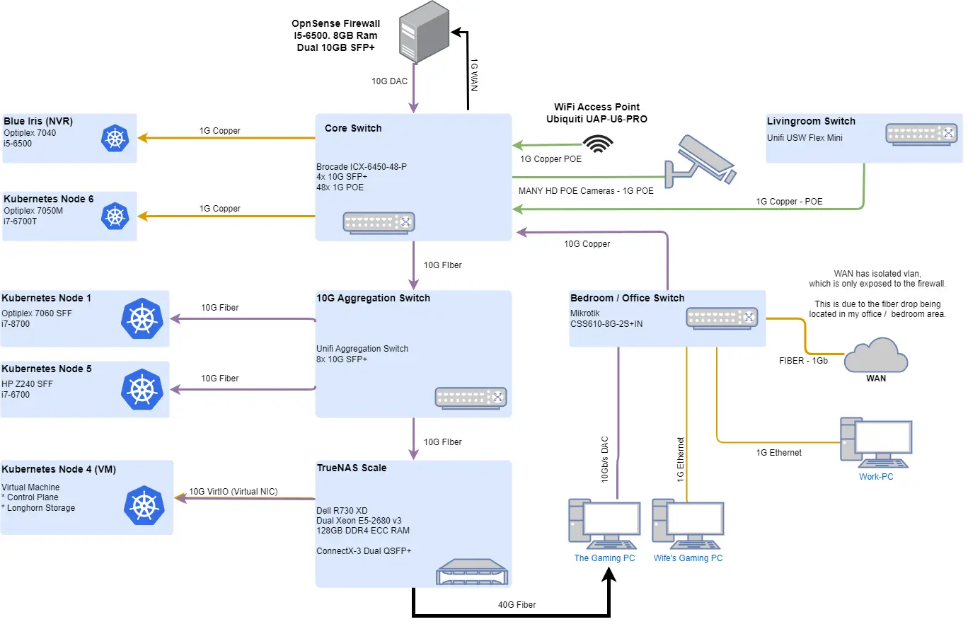 For those wondering why my wan connects to the bedroom switch- its because the fiber is terminated there. I do not have/want to invest in the tools to properly re-terminate the fiber currently.
