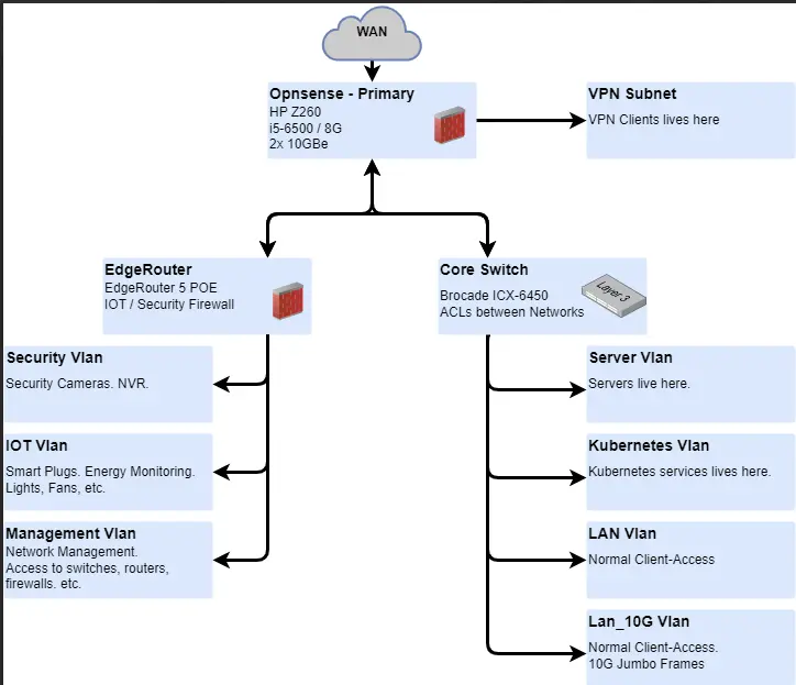 So- I added an existing Edgerouter I had for handling the IOT/Security/Management VLANS, and I moved the LAN/SERVER traffic over to the new Brocade.