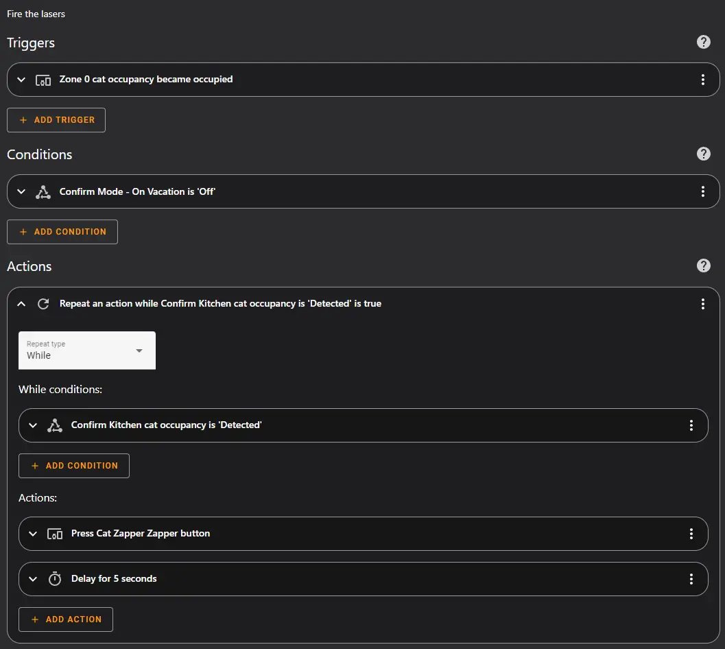 binary_sensor.zone_0_cat_occupancyturns on (ie. there is a cat inside of zone 0) - AND, I am not on vacation