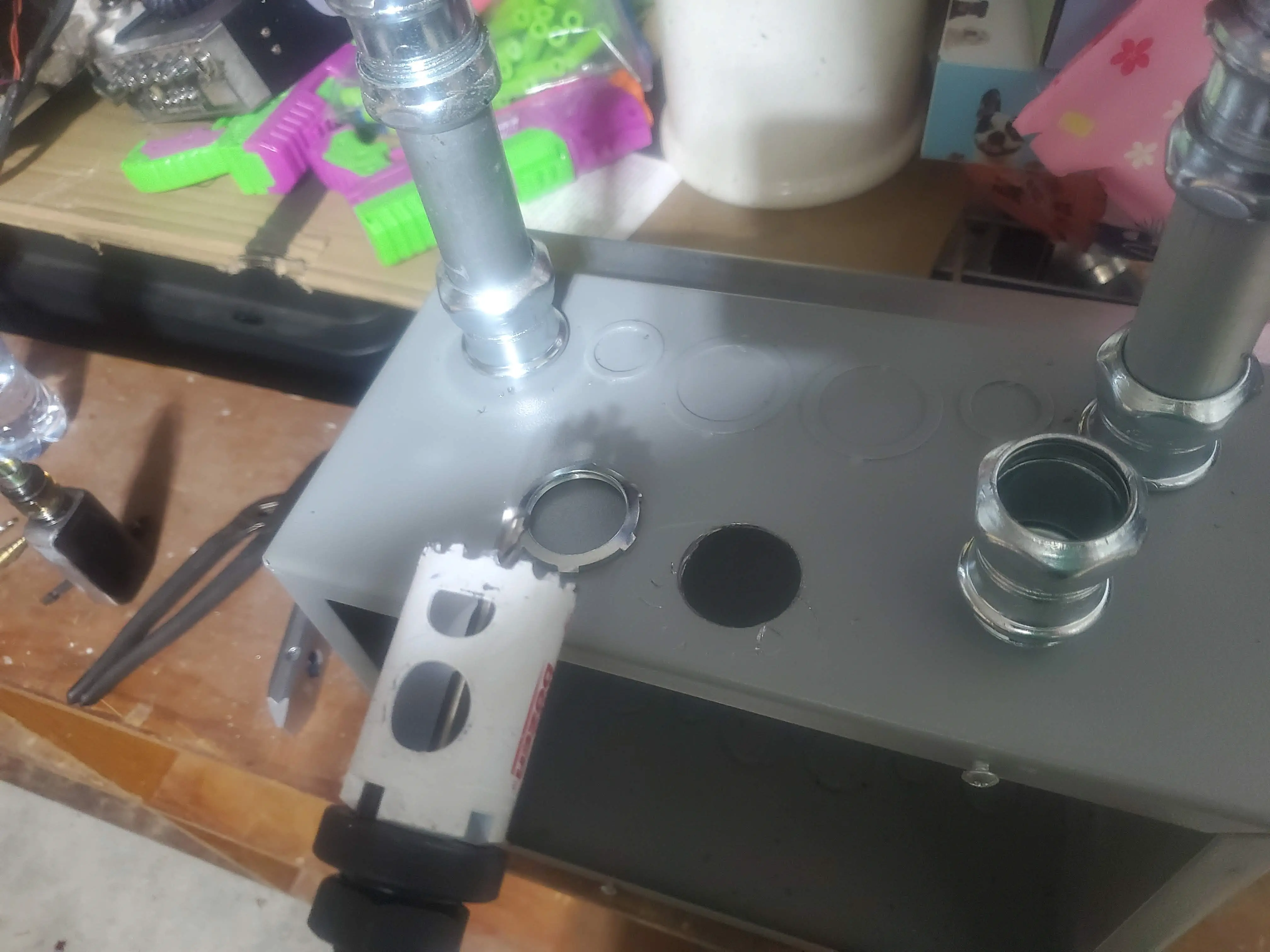 After doing a bit of measuring, I cut 1" holes into the bottom of the new add-on box for the conduit. I cut out 2 6" sections of conduit to go into the bottom.