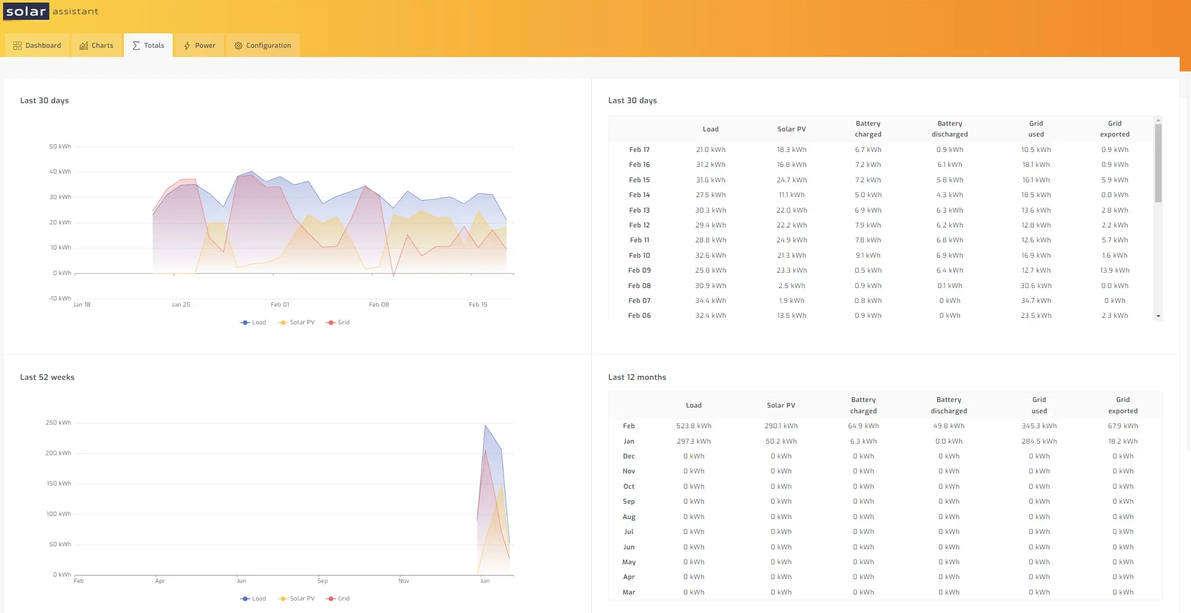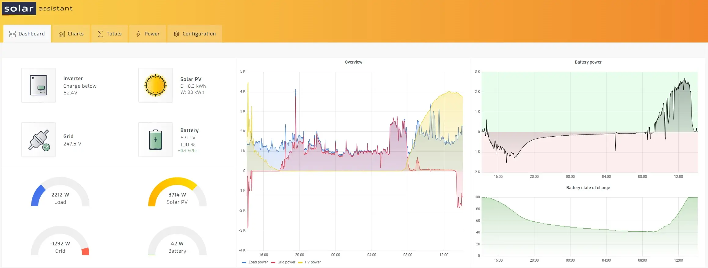 In addition to containing reporting capabilities, solar-assistant also integrates extremely well with home-assistant, and even exposes functionality for home-assistant to change inverter parameters and operating modes.