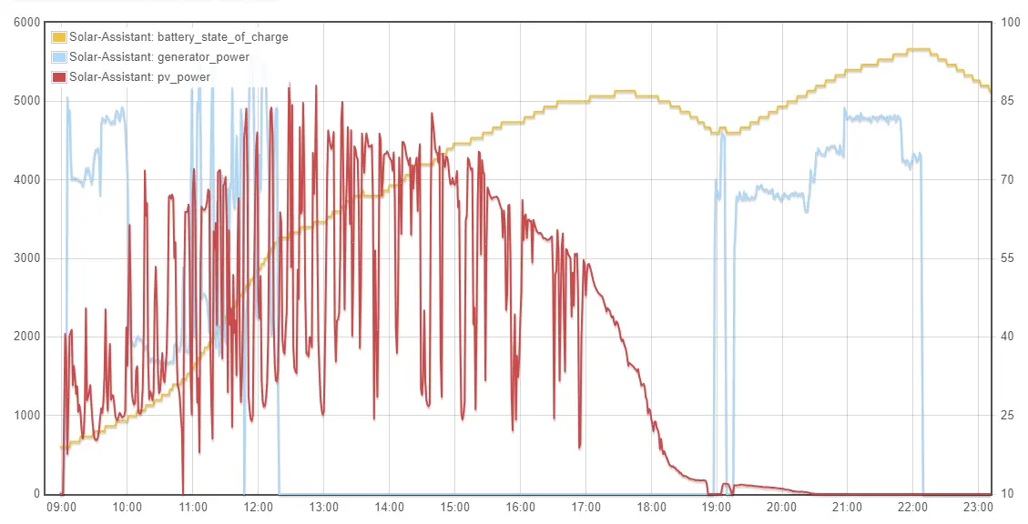 To ensure that the batteries were optimally charged for the night, I decided to run the generator again after PV production ceased in the evening. This continued until around 10 pm, effectively achieving a battery charge level of approximately 95%.
