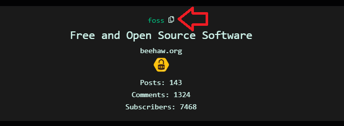 Click the copy icon. This will copy https://beehaw.org/c/foss to your clipboard.