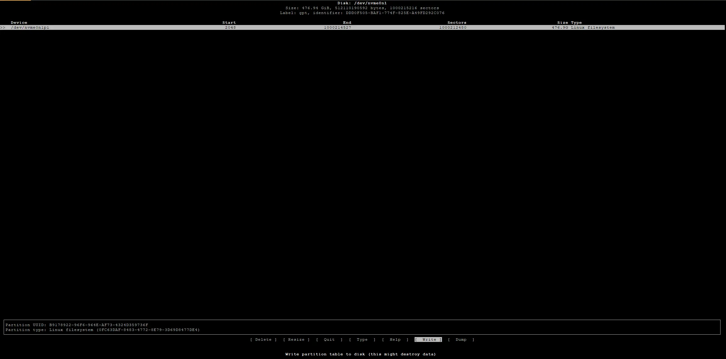 Take note of the new partition name, it will be needed in the next step. In this case, nvme0n1p1 is the new partition.