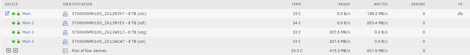 In my quest to optimize on power usage, One of my servers has a zfs pool consisting of 4x 8T disks, in striped mirrors configuration.