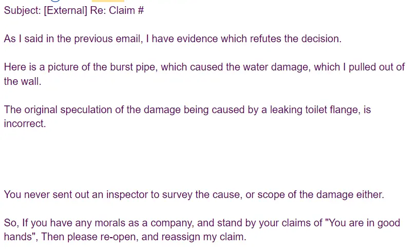 I suspected the damage was caused by a leaking toilet flange. After reviewing the photos, without sending out an inspector, or adjuster, the claim was denied.