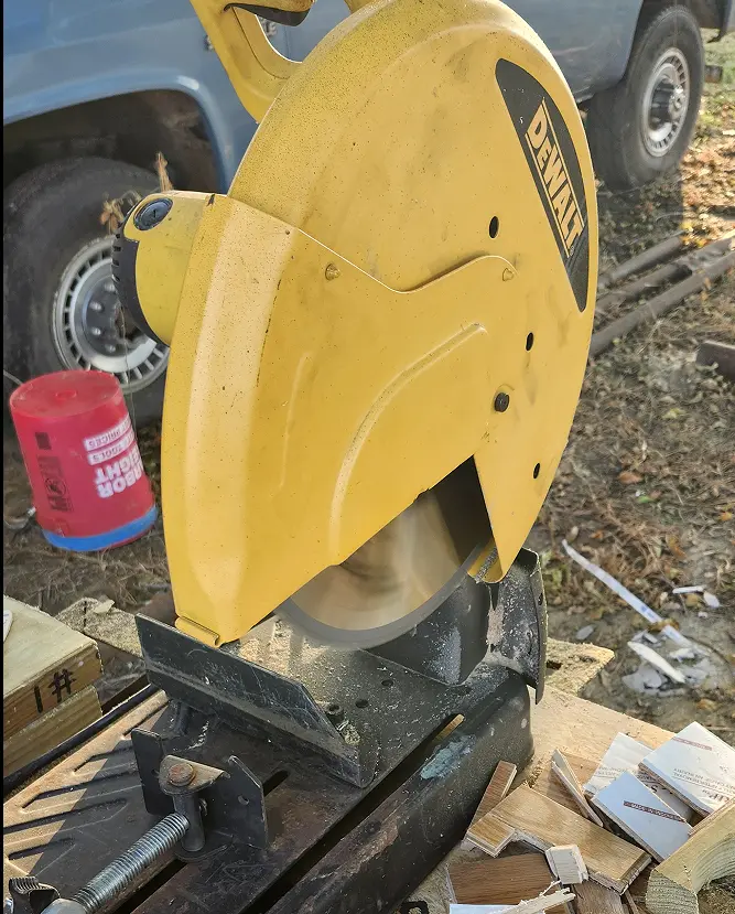 (Image- was taking a bit later when I was doing the wood floor.... but, still provided to give a good idea of the chop saw.)