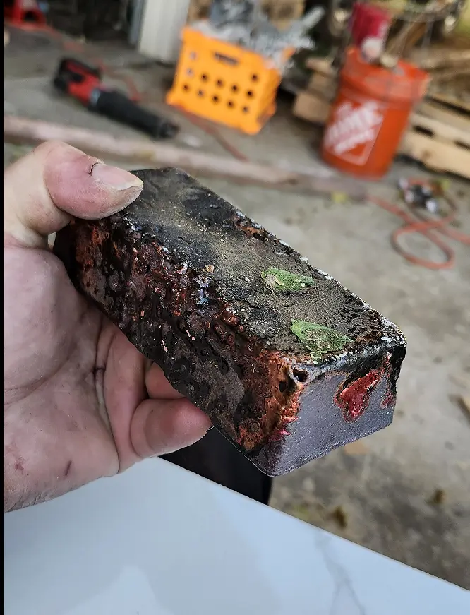 The first copper ingot- Apparently I did not do a good job removing all of the flux before pouring.