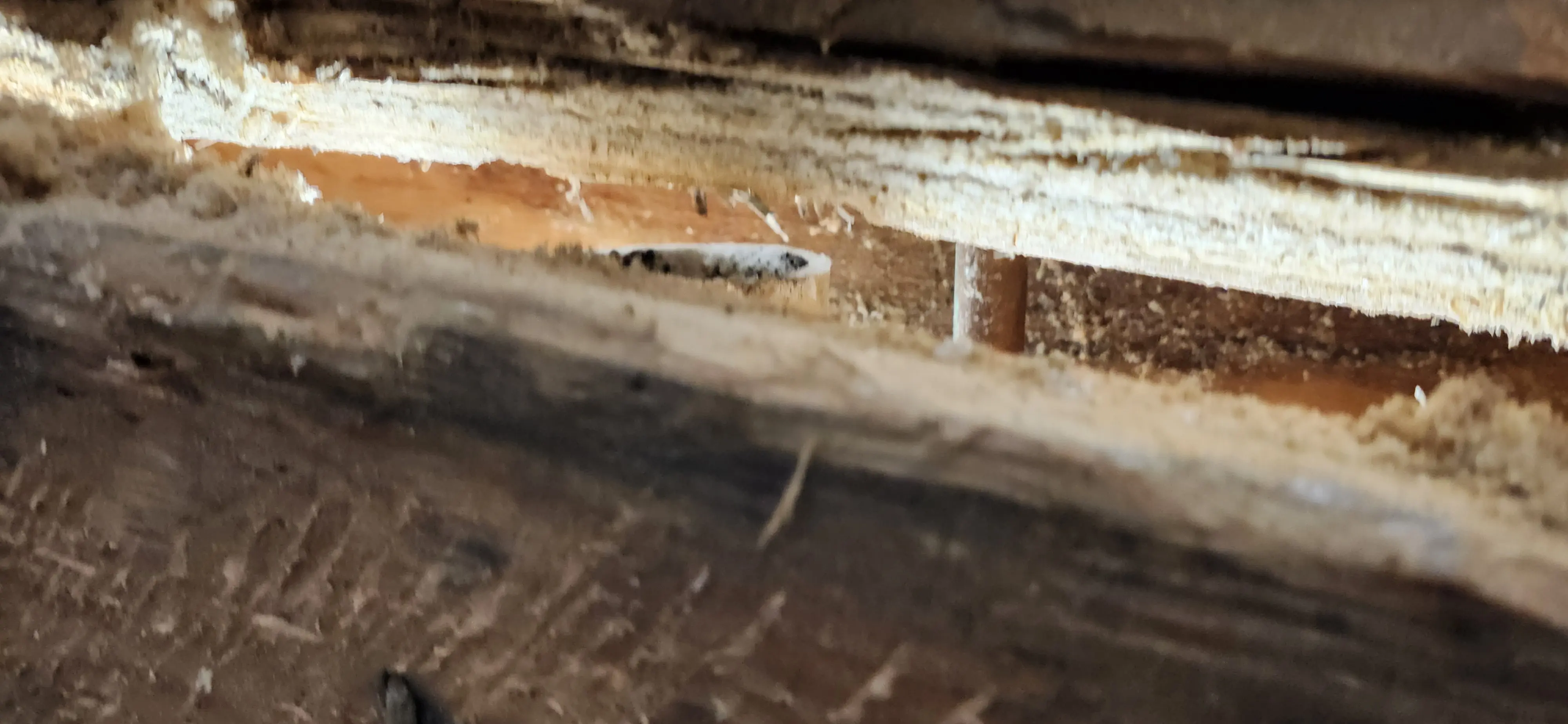 Next- you will notice the plumber who installed this toilet, sliced right through the middle of the joist. (this- is/was responsible for sagging floor issues in the hallway......)