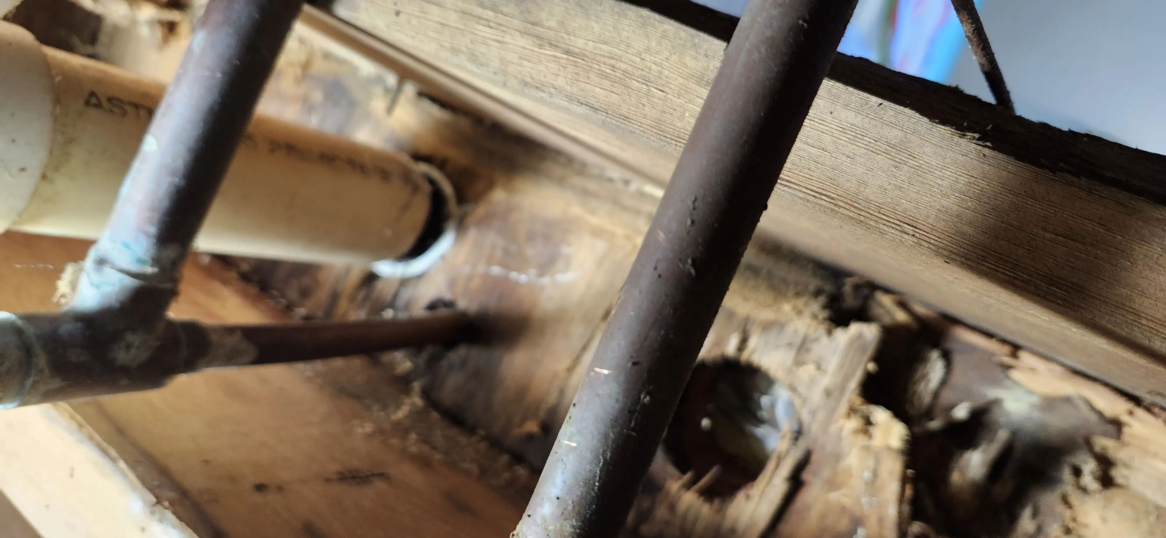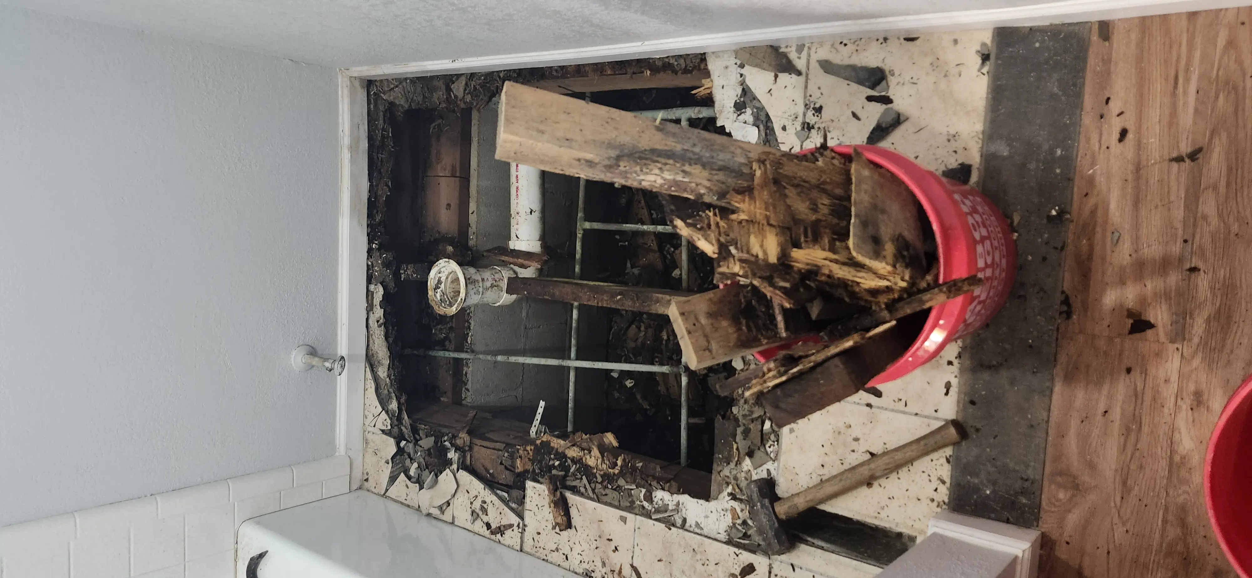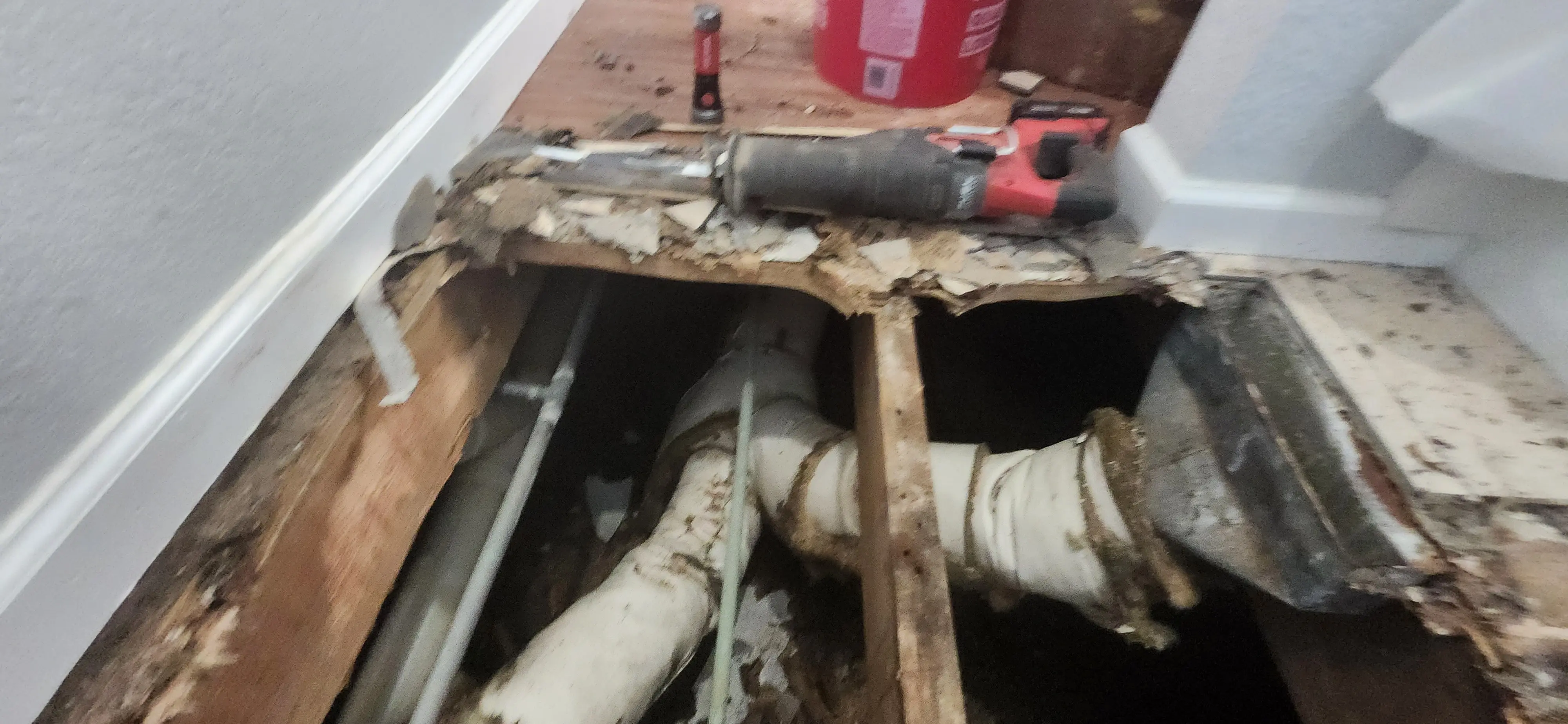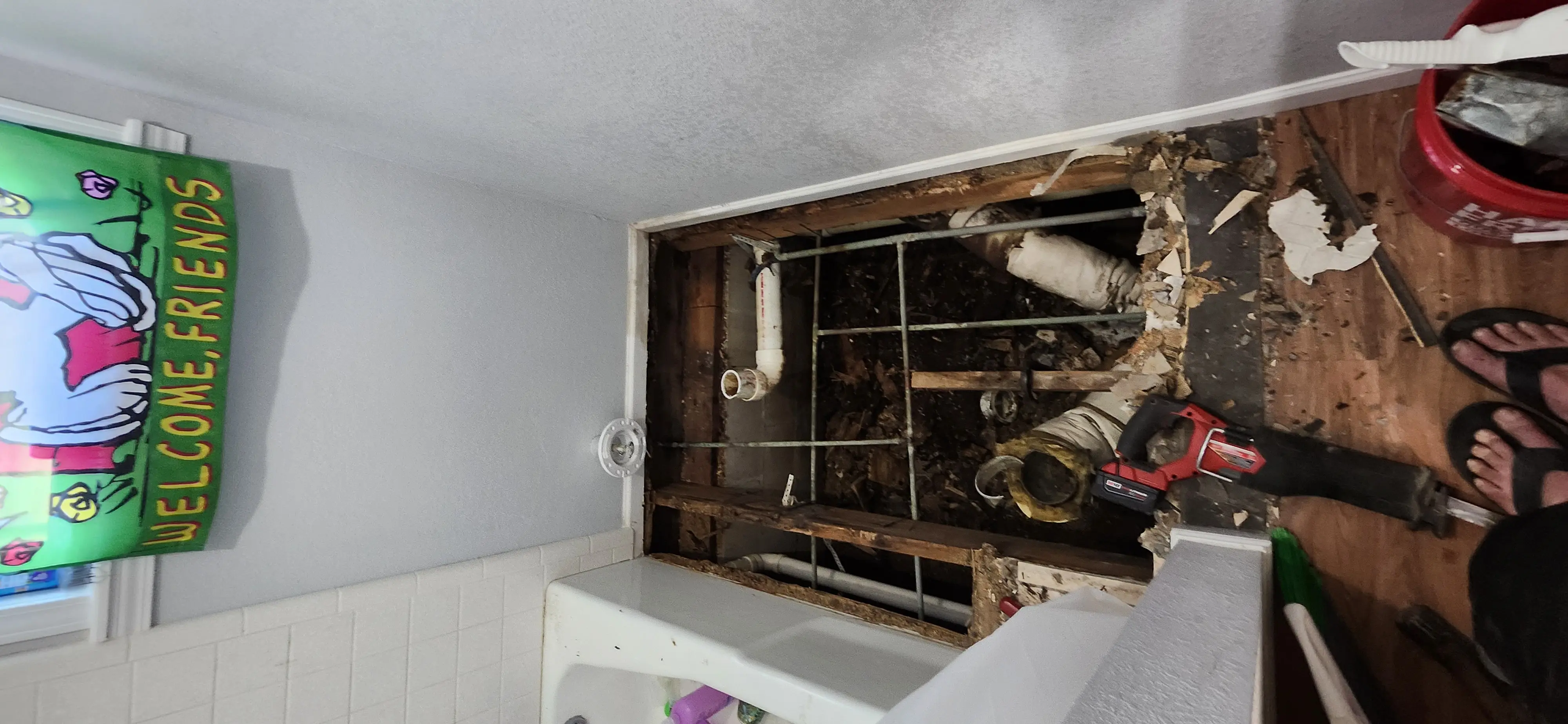 During the removal process, I was using a saw-zall to cut out sections of the rotten subfloor.... and I accidentally nicked a drainage pipe.