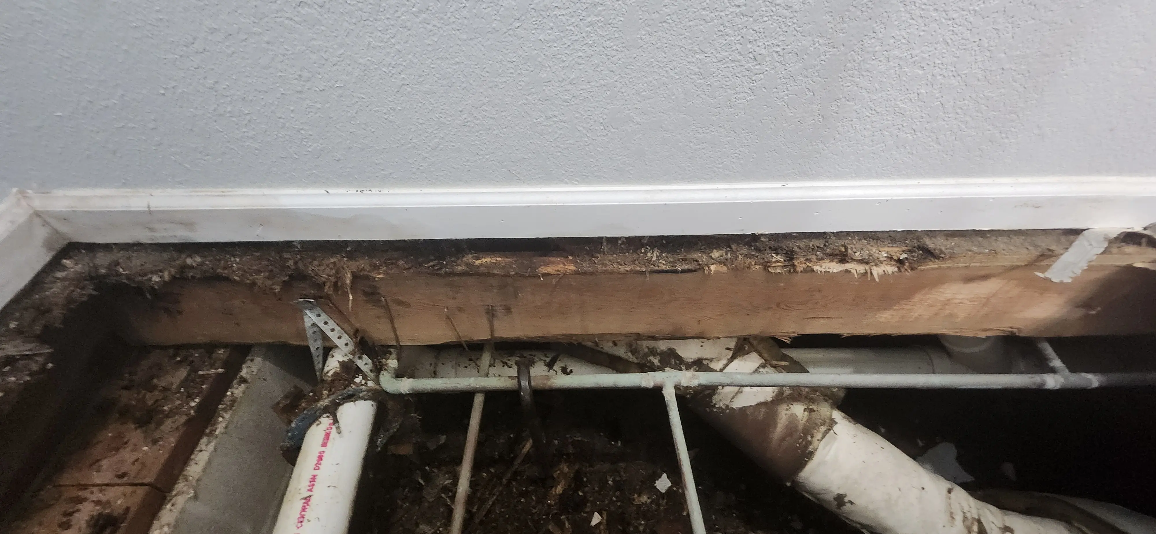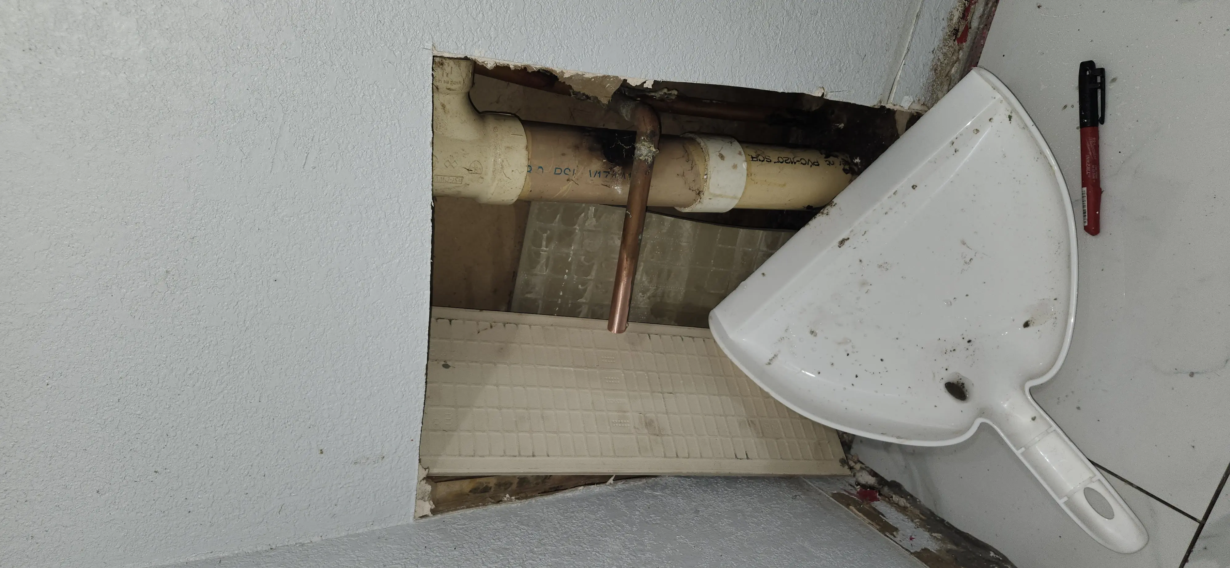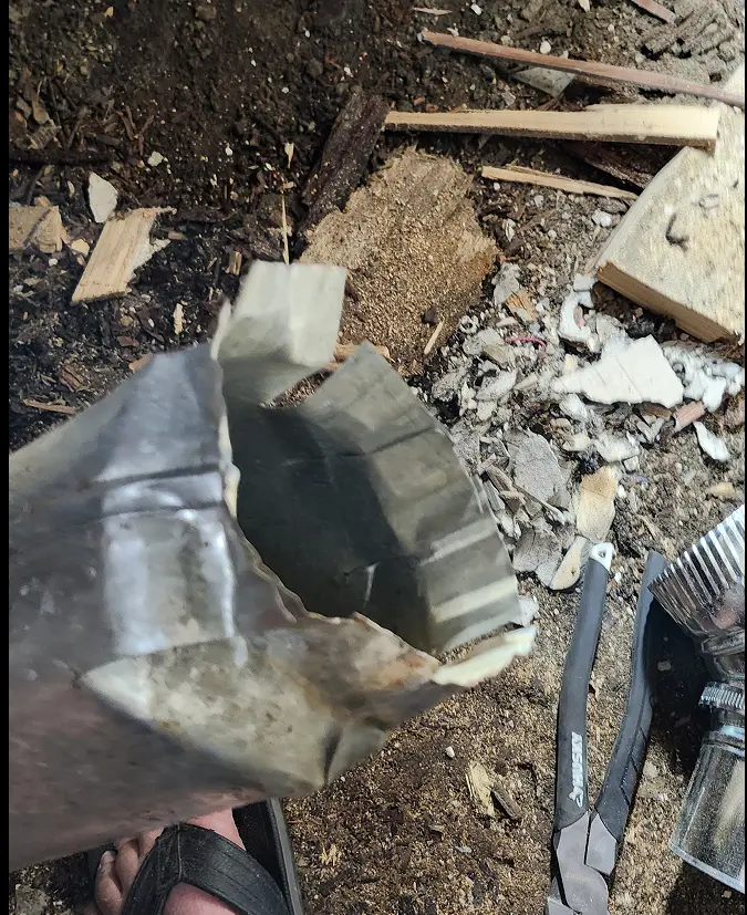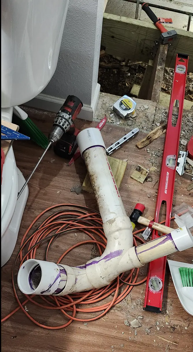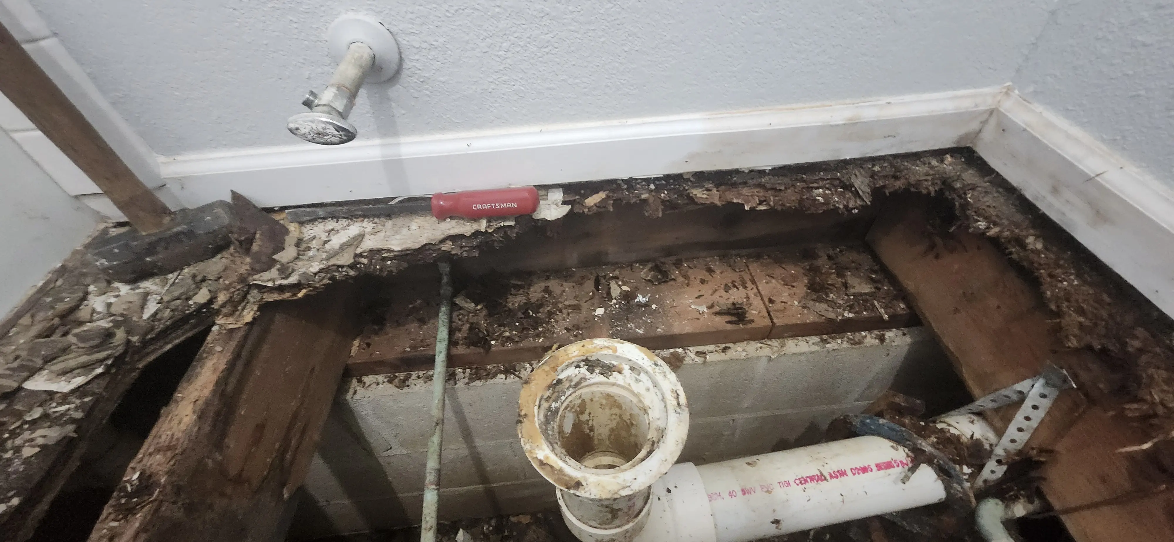 During the removal process, I was using a saw-zall to cut out sections of the rotten subfloor.... and I accidentally nicked a drainage pipe.