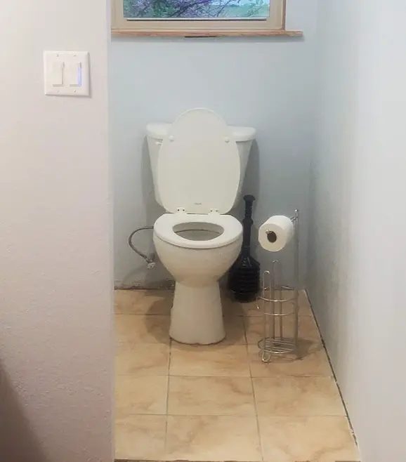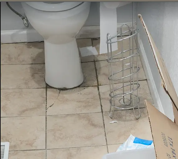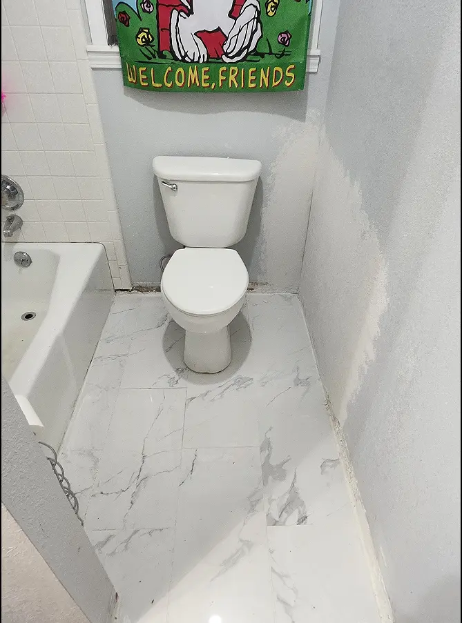 Next- when walking near the toilet, it was pretty obvious the floor was shifting. Looking at the trim on the back-wall- the floor had noticeably sunk as well.