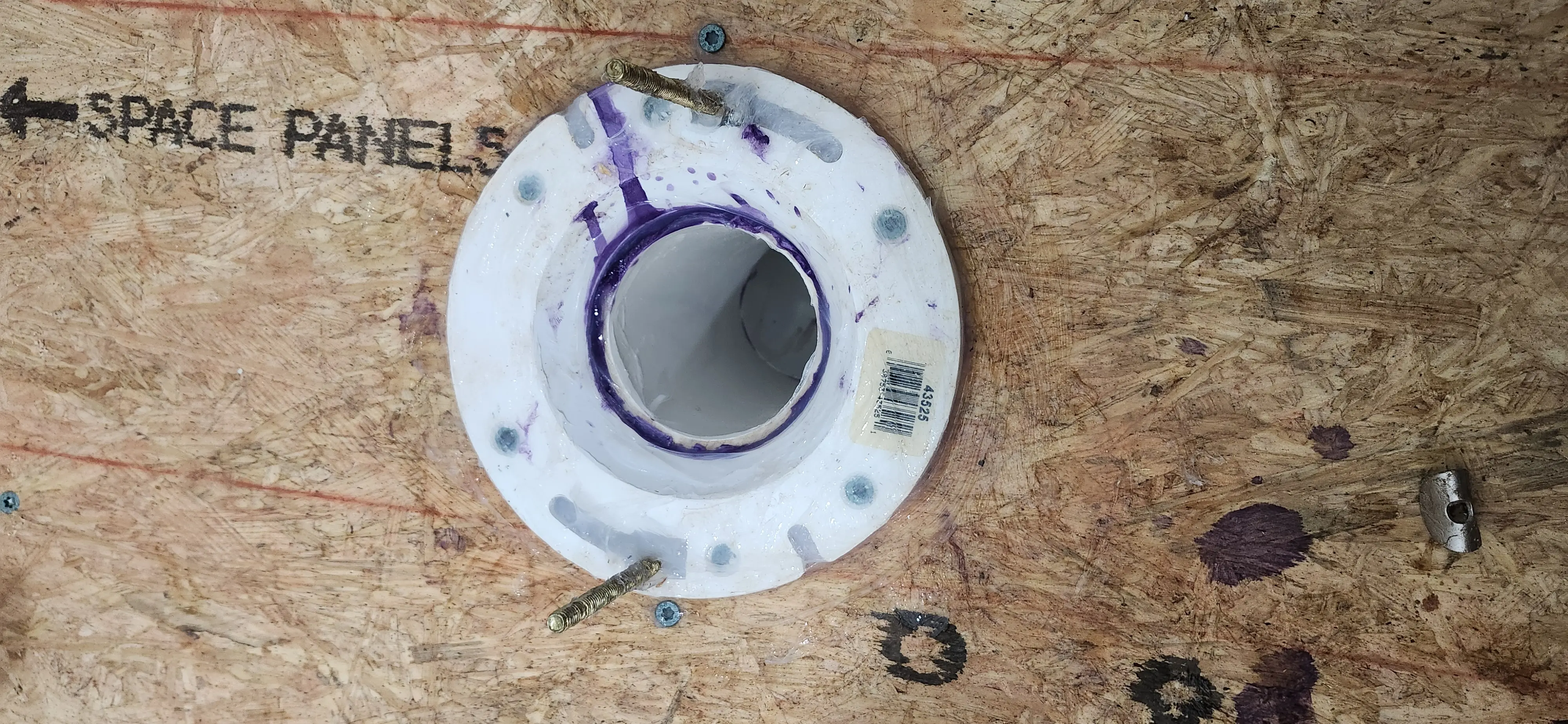 After the sub-floor was installed, a hole for the toilet line was cut with a hole saw, and the toilet flange was installed.