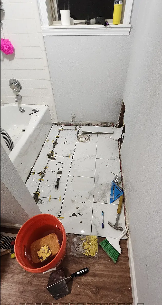 So- not pictured, BEFORE fixing the plumbing issue, we did get around half of the tile layed.