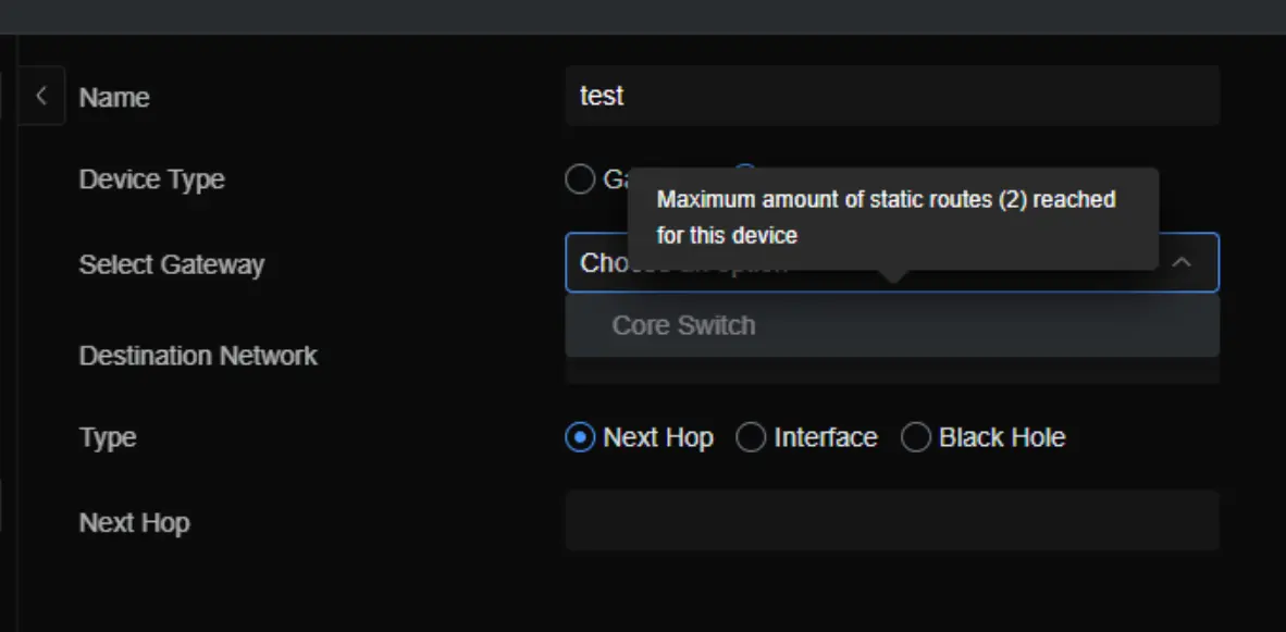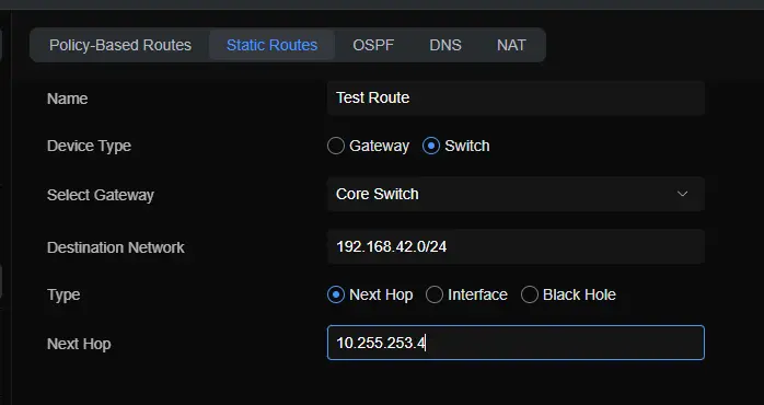 First, create your route through the Unifi's Static routes page. Make sure to click DeviceType: Switch, and select your Layer 3 switch.