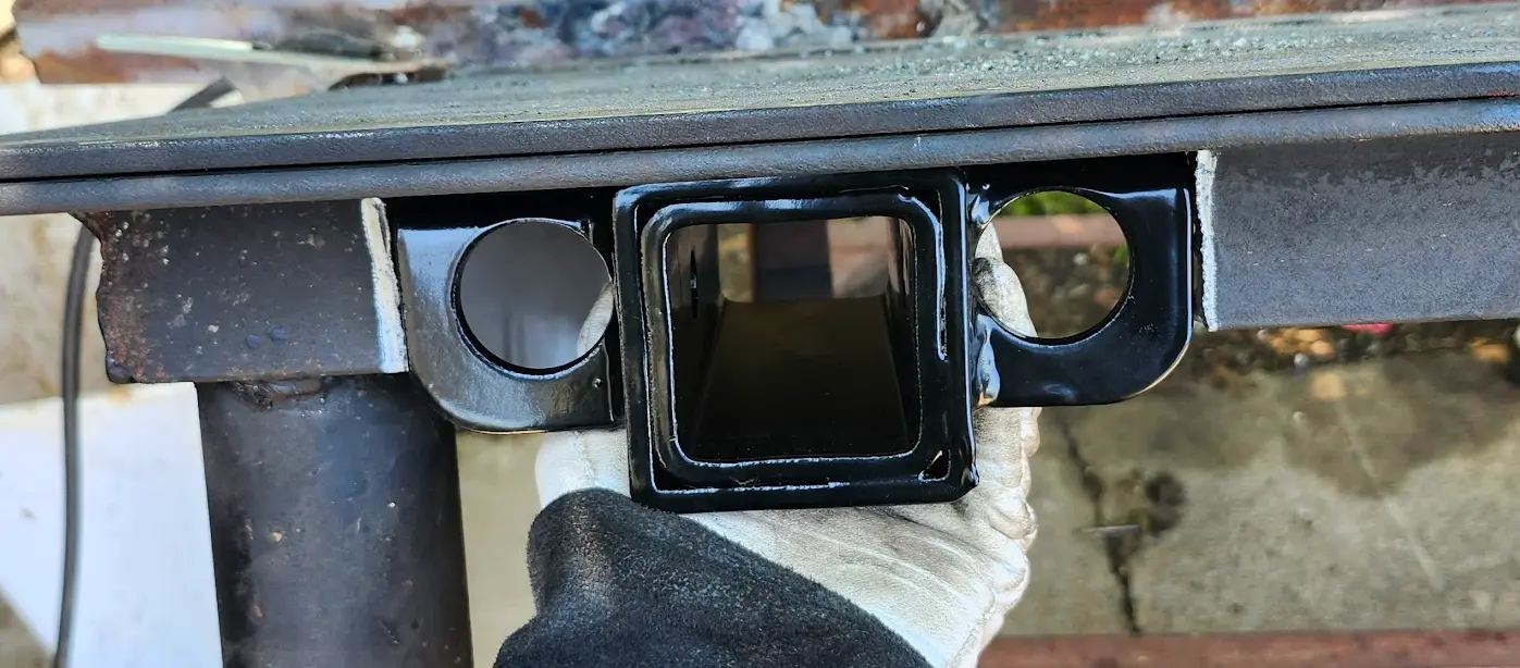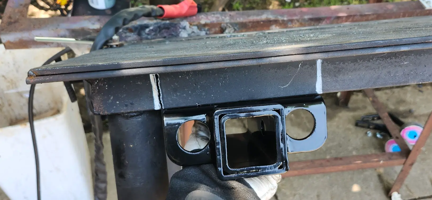 And, finally, the nut was welded onto the receiver hitch, and everything was tightened up, and given a coating of black rust-paint.