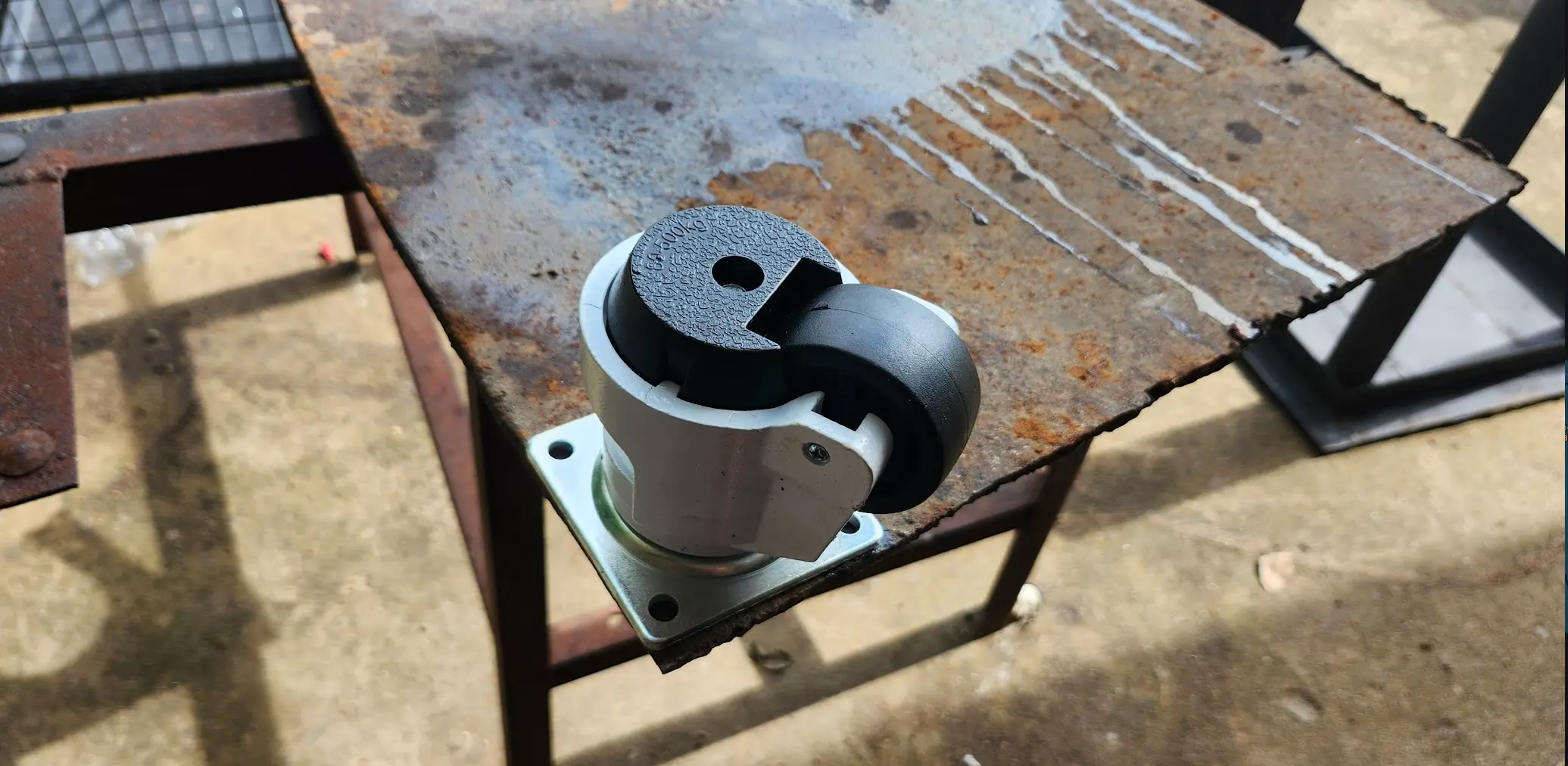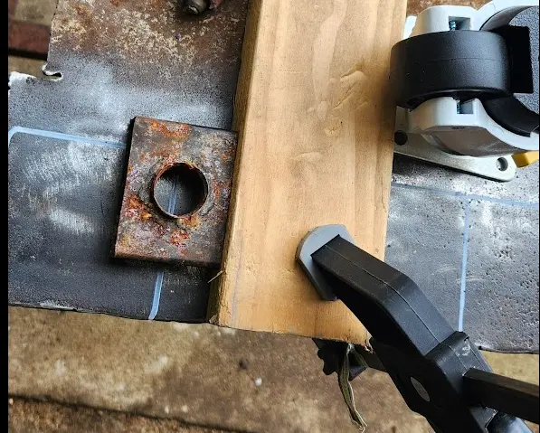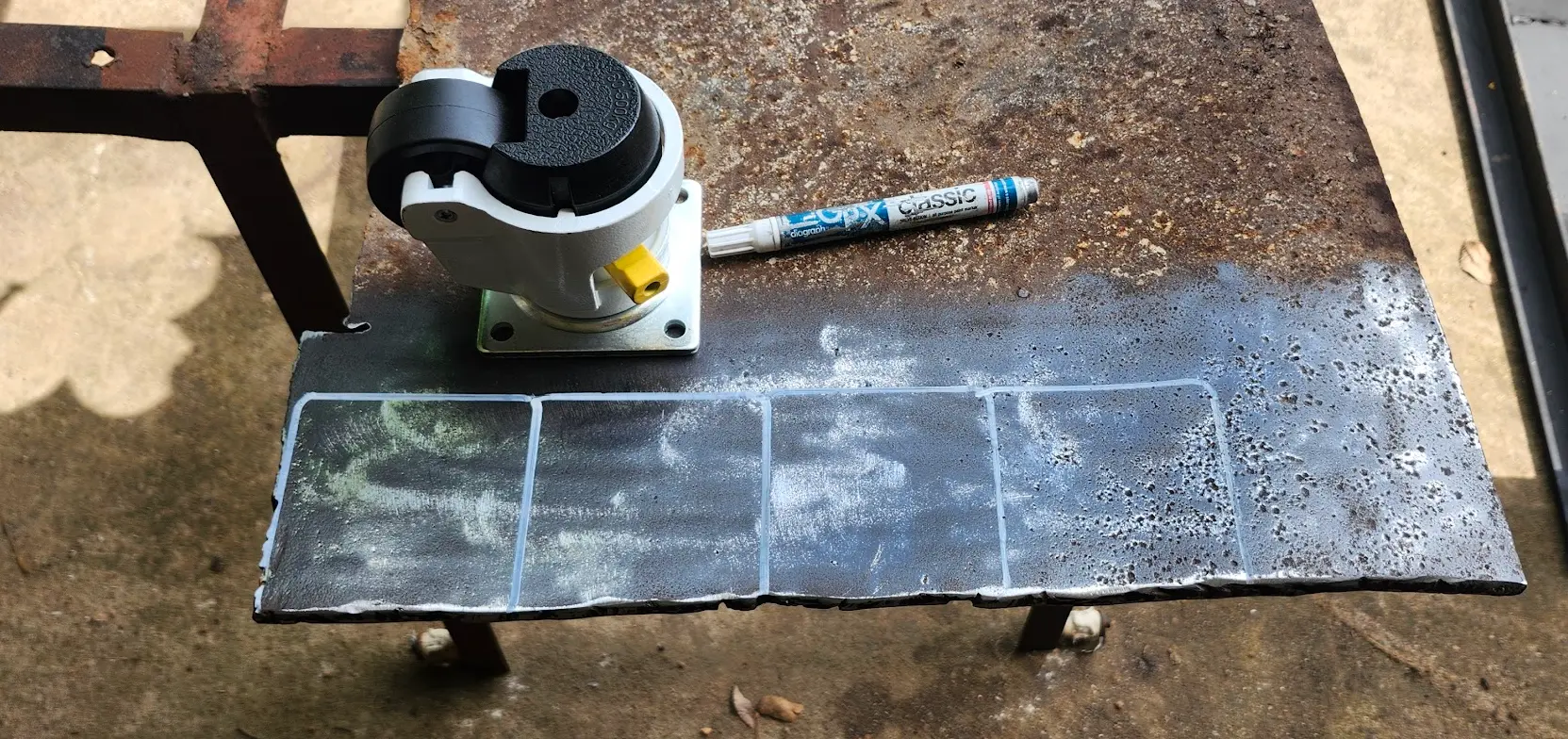 I used my flap disks to remove the rust from the plate, and then traced the outline of the castors using a paint marker.