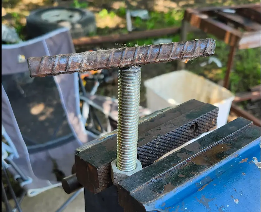 To make this, I used a piece of rusty rebar, along with threaded rod (a bolt with the head chopped off), and a nut.