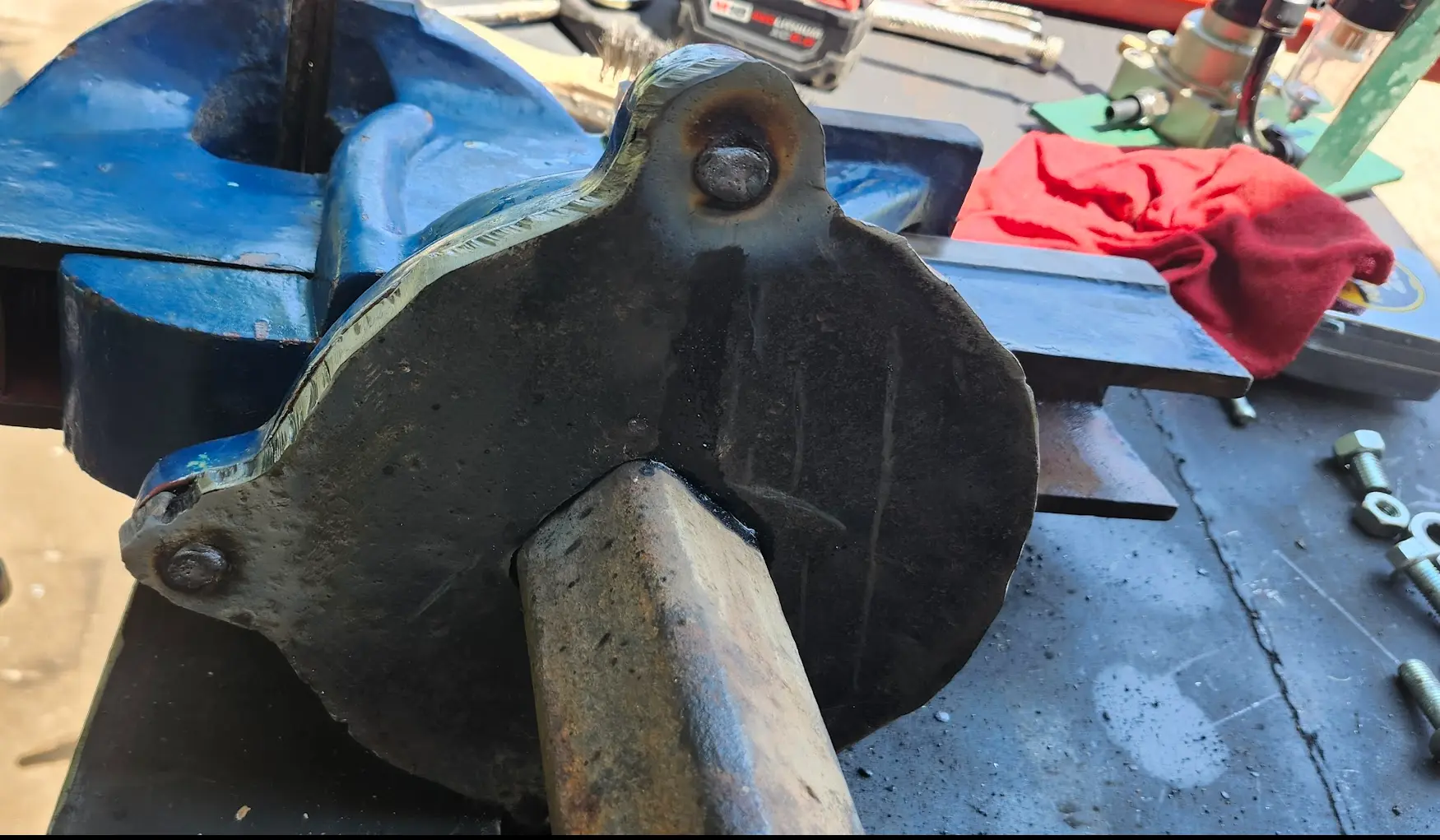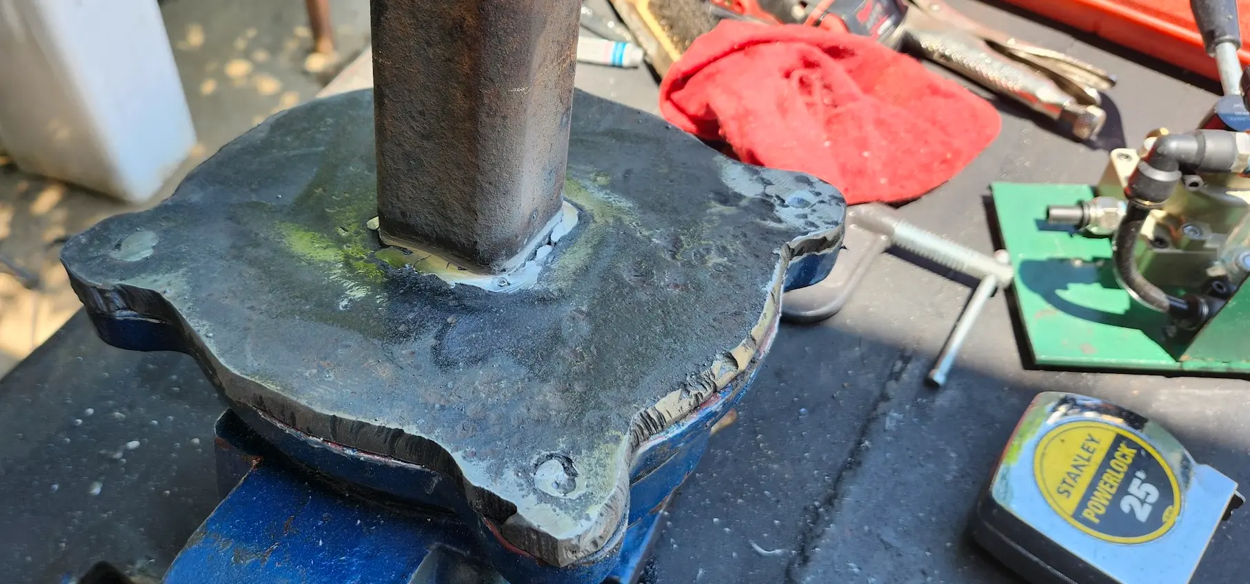 Afterwards, I did a bit of basic grinding and smoothing, and put the vise's base onto the plate.
