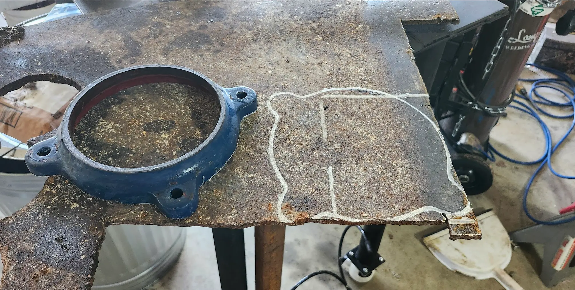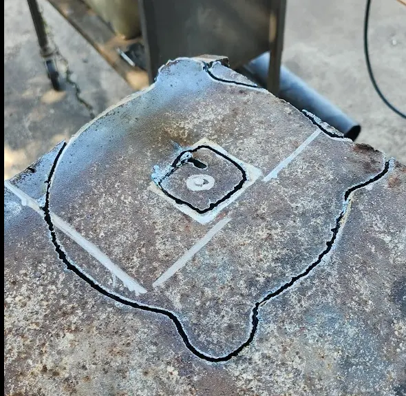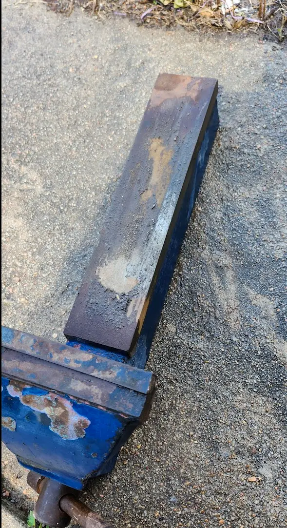 To make the base plate, I used the same rusty piece of plate I pulled out the mud earlier that day. I traced an outline of the vises base onto it using the paint marker.