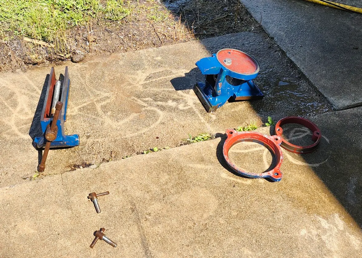 One last thing not pictured- I used some fine-grit sand paper to lightly sand the rust from the hardened surfaces of the vise. After knocking up the surface rust, I coated everything with light oil to prevent it from rusting in the future.