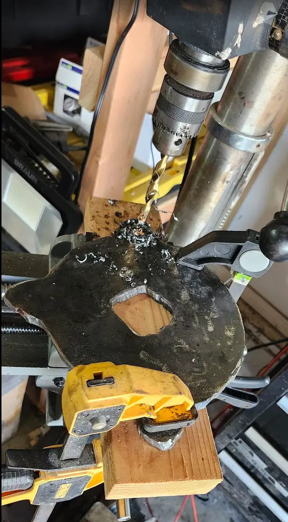 Since.... the plate did not exactly fit the cross-slide vise on my drill press, I used clamps to hold it onto a piece of wood while drilling. Again, make sure to keep those drill bits lubed up!