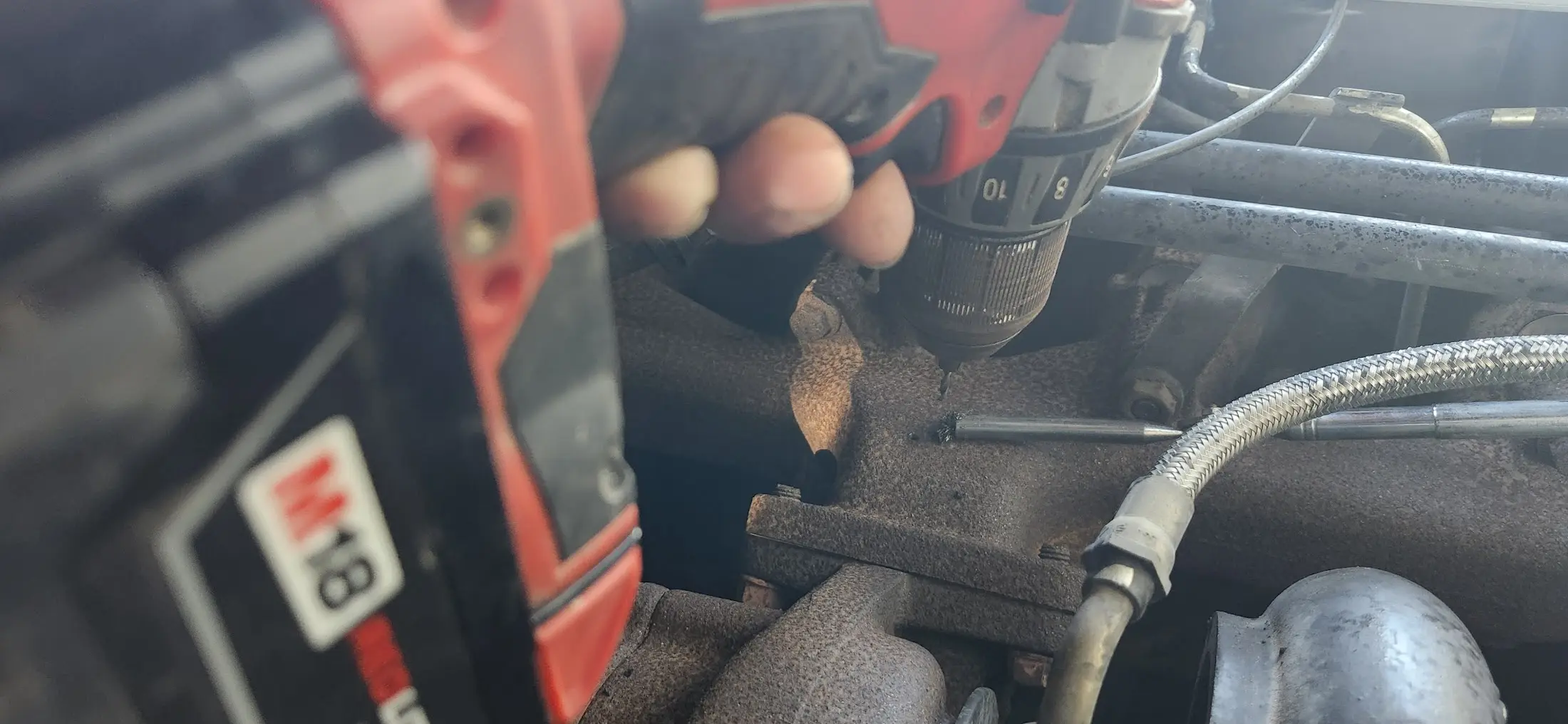The magnet will need to be able to fit into the 1/8"-27 hole we are drilling into the exhaust manifold. Alternatively, you can remove the turbo while drilling the hole, and make sure to remove all of the iron shavings.