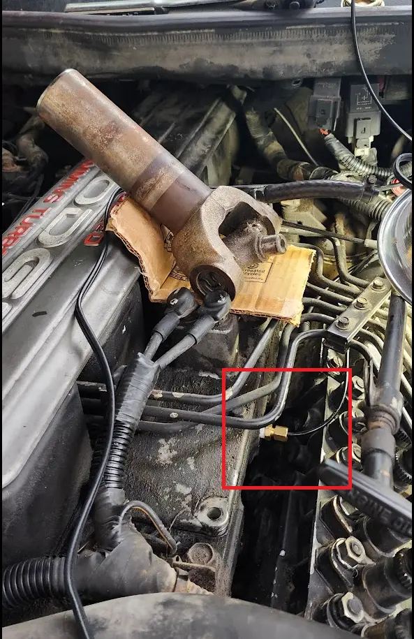 With the horn out of the way, we can see the fuel line. The kit includes a new banjo fitting which the sensor will mount into.