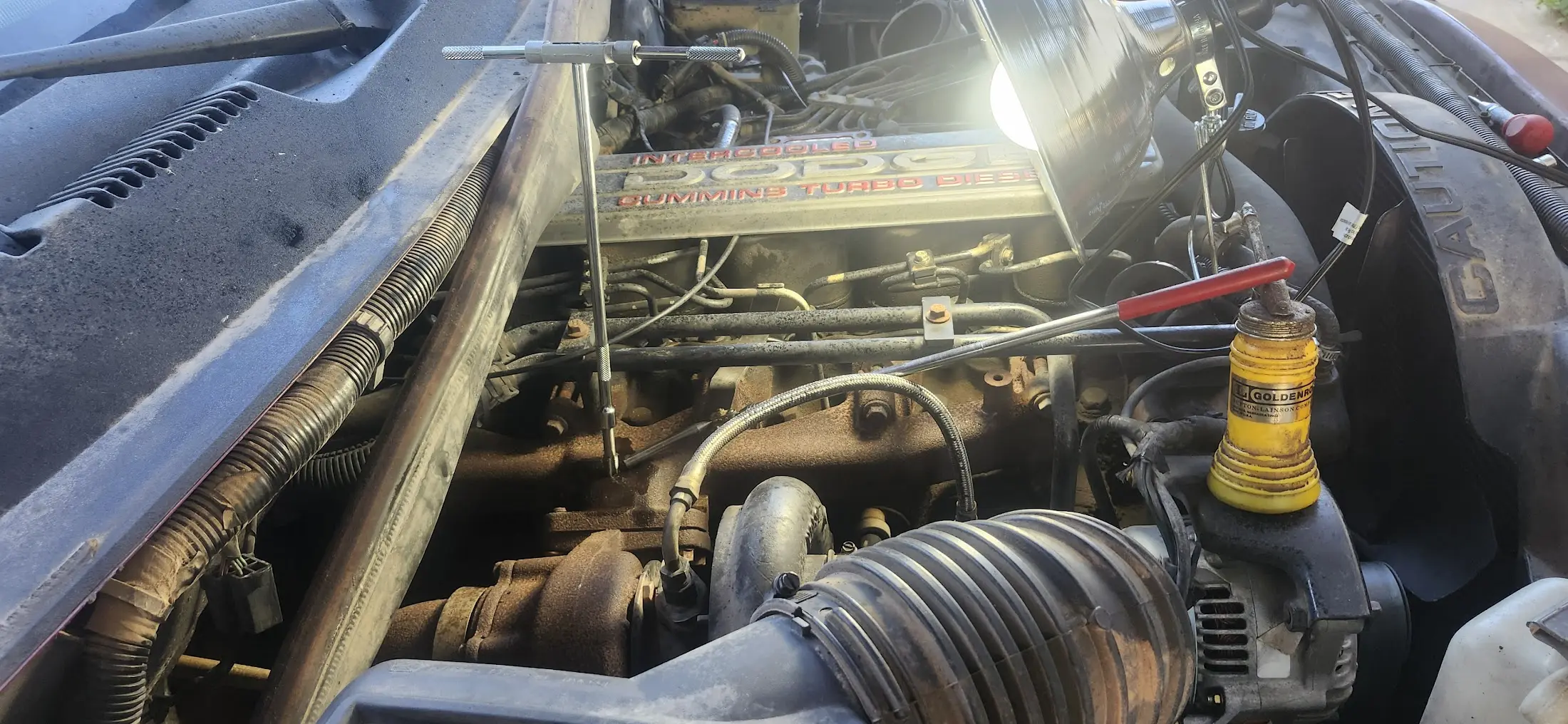 I strongly would recommend removing the intake horn. Four bolts on the intake, one bolt for the dipstick, and loosen the clamp holding on the intake pipe. All 10mm bolts. 18 ft-lbs of torque.